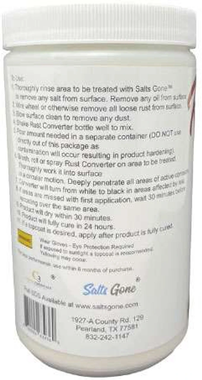 The Salts Gone 32 oz. Rusts Gone Rust Converter Coating helps stop existing rust in its tracks and prevents future corrosion from salt. A little goes a long way. A 32 oz. bottle will cover over 220 square feet of application.