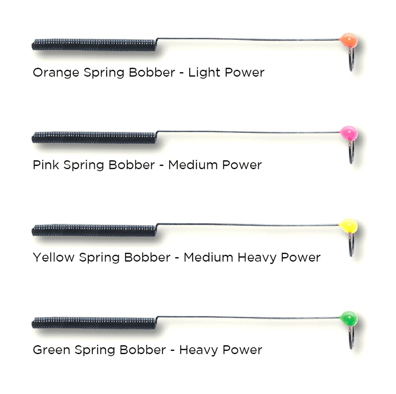 | Model | Light w/ Orange Spring Bobber, Medium w/ Pink Spring Bobber, Medium Heavy w/ Yellow Spring Bobber, Heavy w/ Green Spring Bobber |